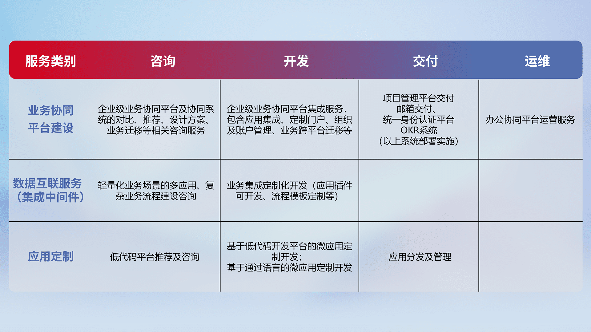 针对钉钉、、企微、、、、IDaas等平台级产品提供产品的规划、、方案、、、、交付、、、定制化开发等服务,,,,实现如统一协同办公、、、智能客户服务、、、混合会议管理、、、智能数据查询、、、等业务场景,,,实现数字化转型。。。。