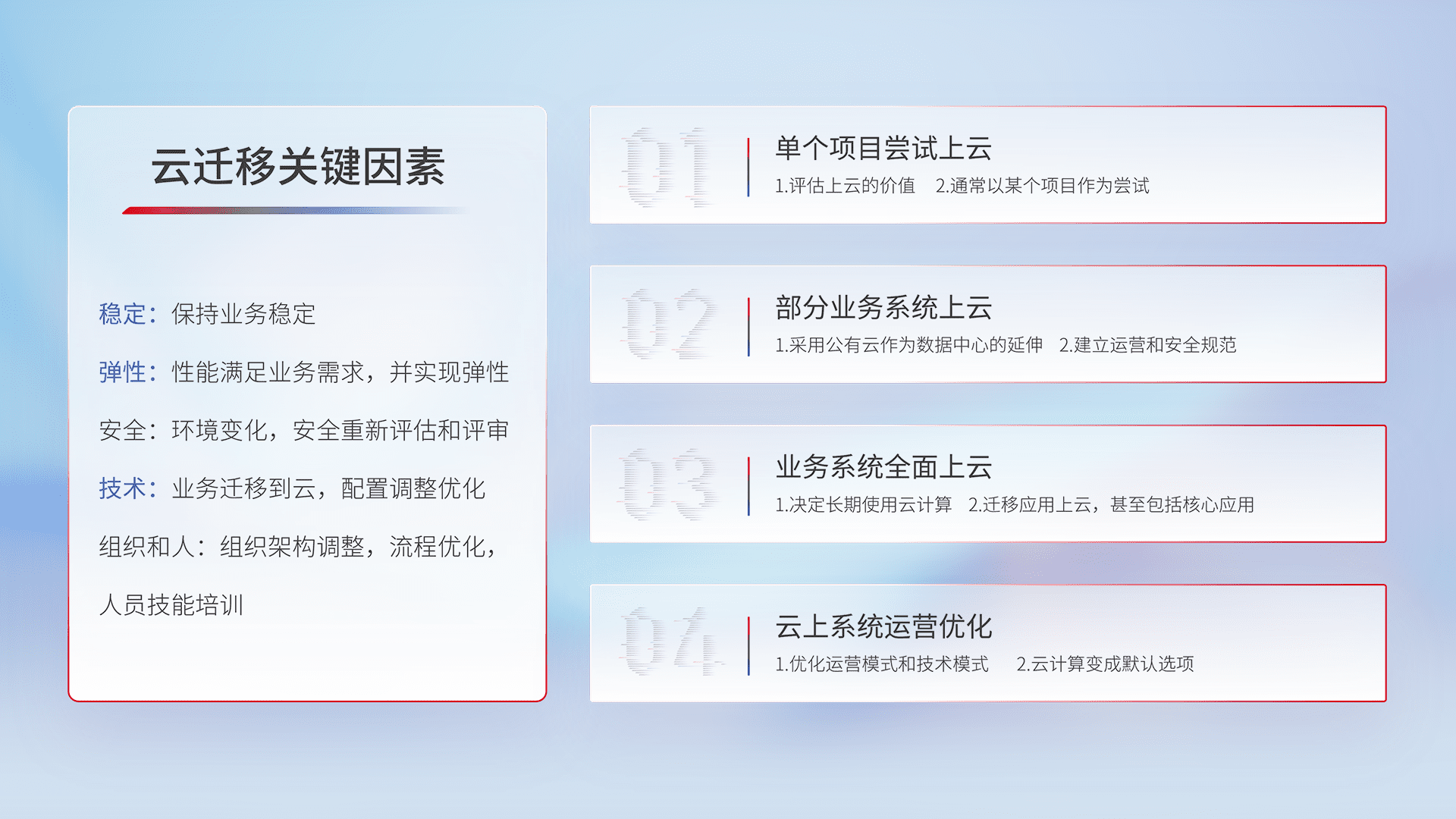 结合实际业务,,,,从规划设计、、、云平台选型、、云原生改造、、、数据迁移、、集成交付,,,,迁移全过程为客户识别最佳上云路径,,,做好风险识别管理,,,,设计网络架构、、、身份权限、、、安全审计合规、、、、操作审计、、、日志审计、、监控告警策略、、多站点容灾设计等,,,对云上基础设施进行整体规划,,提升IT治理水平,,,,以满足弹性、、、高可用、、高性能的需求。。。